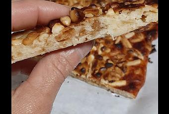 Extender la masa entre 2 papeLes de horno, poner en el centro la mitad de los chicharrones y del edulcorante elegido, doblar la mitad de la masa sobre los chicharrones, poner encima la otra mitad de los chicharrones y más edulcorante, doblar la otra mitad sobre los chicharrones, poner por encima las almendras fileteadas, los piñones y el edulcorante.