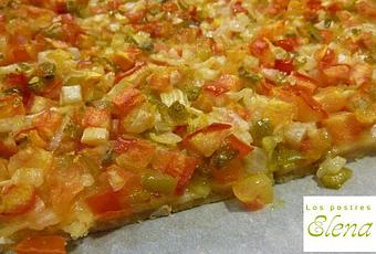 Picamos el tomate, la cebolla, el pimiento verde en dados, lo aliñamos con aceite, sal y pimienta. Removemos bien y cubrimos toda la masa. Horneamos a 180ºC unos 30 minutos.Yo la he tomado templada y fría y está muy buena.