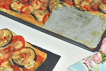Mientras tanto, que os parece si preparamos una cena rápida y que seguro gustará a todos. Una coca con unos ingredientes que para mi combinados son éxito seguro: tomate y berenjena. Habitualmente en casa como más lo preparamos es en forma de milhojas, pero en esta coca combinado con unas gambitas también está delicioso. La idea la saqué del estupendo blog Atrapada en mi cocina, pero yo decidí usar berenjena en lugar de calabacín (aunque seguro que con calabacín también está genial).