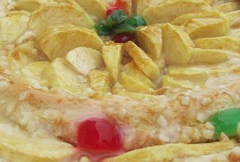 7- Cortar las manzanas en gajos, rociarlas con el zumo de 1 limón e ir colocándolas en el centro, y clavando a modo de cordón algunos gajos en el medio del borde.