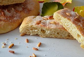 500 gr de harina 10 gr de sal35 ml de aceite de oliva virgen extra300 ml de agua fría10 gr de levadura fresca****aceite de olivapiñonesazúcar anís dulce