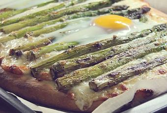 - Retiramos el film de la coca, extendemos sobre la masa la mezcla de nata y queso, ponemos las rodajitas de rulo de cabra, los espárragos y se cascan dos huevos encima.