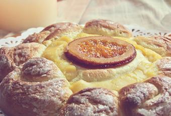 - Pasada la media hora...Pincelamos el sol con leche. Decoramos con azúcar humedecido, una rodaja de naranja y crema pastelera.