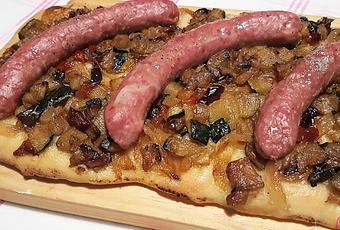 Salchichas frescas 1 berenjena1 calabacín pequeño1 cebollaPimiento rojoAceite de oliva aromatizado con romero para el acabado.