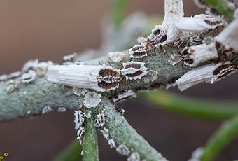 En principio pensé que era Icerya purchasi pero me di cuenta que su tamaño era inferior, finalmente concluimos que se trataba de Orthezia insignis, una cochinilla que posiblemente haya sido introducida mediante agricultura o la jardinería.