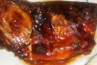 Ponemos en el fondo de la bandeja 250 ml. de agua y vinagre mitad de cada, conviene que tenga siempre en el fondo liquido, y le ponemos encima unas bolas pequeñas de manteca, y metemos en el horno precalentado.