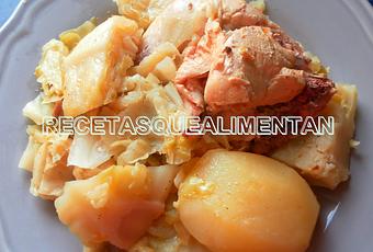 Una col mediana, medio pollo, un chorizo poco curado, 4 patatas medianas, una cebolla, 2 dientes de ajo, una hoja de laurel, romero, pimienta negra molida, un chorro de aceite de oliva, agua y sal.