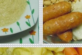 Como os decía antes, yo he elegido el "Cocido Madrileño" como buena Madrileña que soy, este en particular consta de tres vuelcos. Primero se sirve la sopa con fideos. Después se presentan los garbanzos en una fuente con las verduras: el repollo rehogado, la zanahoria y el nabo en rodajas. El tercer vuelco está formado por las carnes troceadas, las chacinas (carnes conservadas, adobadas o embutidas), el tocino y el tuétano de los huesos de caña, en mi casa más comúnmente conocido como "Chucho pachucho" jajaja