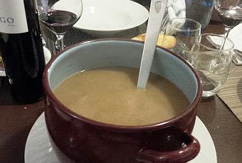 - Llegó la sopa, en un perol que te dejaban encima de la mesa para repetir tantas veces como quisieras. El sabor era intenso aunque algo pasado de sal. El fideo estaba duro, algo que a algunos comensales gustó y a otros no. Como acompañamiento unas piparras.
