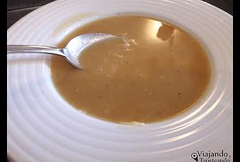 Llega el primer vuelco: la sopa. Servida en sopera que dejan en la mesa para repetir es espesa, contundente en textura, aunque no tiene demasiado sabor a cocido. Parece como si estuviera espesada con garbanzos machacados y condimentada con algún "ingrediente artificial". Aún así estaba buena y los tres comensales de la mesa repetimos.