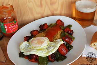 Ingredientes: Garbanzos del cocido (cucharón y medio por persona)1/2 cebolla100 ml. de aove2 chorizos4 pimientos verdes1 huevo por persona...como mínimoSalsa de tomate casera