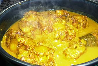 Una vez sellados, se incorpora a la olla exprés, se le añade el azafrán, el aceite que haya quedado en la sartén, el vino blanco y agua hasta cubrir. Cerramos la olla, la ponemos a hervir. A los 20 minutos de haber salido el pitorro de la olla exprés, se abre con cuidado y se mira. Si está aun dura y con poco caldo, se le añade más agua y se deja hervir más tiempo.