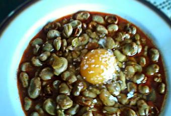 Añadimos el majado, agua y sal. Dejamos esponjar un poco el pan. Una vez esponjado, lo ponemos en el mortero, lo majamos y lo incorporamos a las habas. Dejamos hervir hasta que las habas estén tiernas. Antes de servir, cuajamos un huevo por comensal.