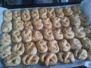 Mezclar los ingredientes hasta conseguir una masa suave y que no se pegue a los dedos. Dejar reposar media hora. Se pueden presentar con diversas formas: forma de deditos, cÃrculos o en forma de pretzels como las que aparecen en la foto.Batir el huevo y pintar las piezas con una brochita. Finalmente, espolvorear sobre las piezas con granos de ajonjoli. Hornear 180 grados hasta que estén doraditas.