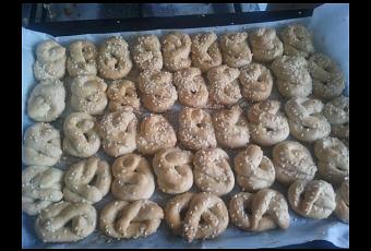 1 kilo de harina tamizada250 g de margarina1 vaso de aceite2 cucharaditas de sal2 cucharaditas de azúcar1 sobrecito de de polvo de hornear (Afkat afia) (Baking Powder) o levadura liofilizada de cualquier otra marca.2 vasos de agua tibia granos de ajonjoli (sumsum/sésamo)1 huevo para pintar las piezas