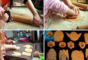 La experiencia del bebé fue satisfactoria: entretenida, estimulante y razonablemente guarra; pero no de las mejores. Usar el rodillo y cortar galletas son acciones mecánicas más monótonas que combinar los ingredientes de una magdalena o decorar una pizza, así que una vez vista una galleta "de monstruo", vistas todas.