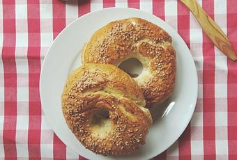 Poner una cacerola con agua abundante y una cucharada de azúcar a hervir, cuando rompa a hervir poner los bagels uno a uno durante 15 segundos por cada lado. Sacarlos y ponerlos en una bandeja de horno que habíamos forrado previamente. Pincelar con huevo batido y poner las semillas de sésamo por encima.