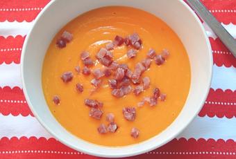 Para recrear ese rojo, nada mejor que los tomates, y por eso elegí hacer un salmorejo con los tomates asados, que había visto Crockpotting que se come frío, que es apto para estos últimos días de verano y que en casa nos encanta. Nosotros en esta ocasión lo hemos hecho con pan sin gluten y muy poquito ajo, los tomates están asados en la crockpot pero vosotros podéis hacerlo con el pan normal, con ajo al gusto y con los tomates asados en el horno. Además, por encima a nosotros nos gusta ponerle jamón serrano en taquitos, pero podéis agregarle huevo cocido o las dos cosas.