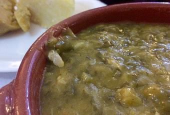 Llegó el plato y era un guiso espeso y con mucho verde en un cuenco de barro. Junto a él otro platito con sendos trozos de lo que parecía una tortilla de patata española y otra cosa más oscura. Ambos me los colocaron al lado de mi plato vacío.