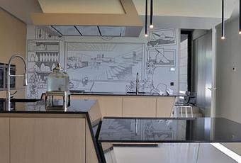 Asimismo, las referencias escultóricas, tan características del trabajo A-cero, se pueden apreciar en las encimeras, armarios y mesas, cuyas formas geométricas y líneas quebradas otorgan una personalidad inigualable y diferente respecto a las tradicionales cocinas.