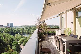 Hoy nos fijamos especialmente en el exterior de este impresionante ático sueco, con 96 m2 de vivienda y 250 m2 de terraza repartida en dos plantas. Por su diseño, este piso parece una villa colocada en lo alto de un edificio, con una terraza que la rodea completamente y un solarium que ocupa toda la superficie del tejado. Para muchos es una vivienda perfecta, porque reúne todos los beneficios de vivir en una comunidad y en la ciudad, pero con amplitud y sin molestias de vecinos.