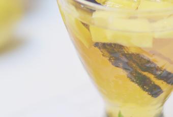 En un vaso ponemos aproximadamente 50 g de mango, pelado y cortado en cubos pequeños.Añadimos unas rodajas de limón.A continuación un chorro de licor de melocotón sin alcohol.Y por último rellenamos con la cerveza.Para decorar colocamos unas hojas de hierbaluisa que es muy aromática e impregnará el ambiente de limón.