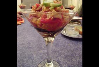 - Montar en una copa de cóctel, primero el plátano machacado, luego la mezcla de alitas, y finalmente, unos cubos de aguacate. Añadir un chorrito de aceite y sal en escamas.