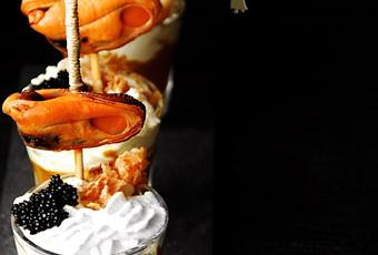 Rellenamos los vasitos tal como hemosindicado. Una vez llenos, introducimos una brocheta con un mejillón quehabremos reservado —las brochetas, también las hemos hechonosotros— ponemos encima de la nata mediacucharadita de huevas y la cebolla crujiente. Servimos las cucharillas con elmazapán de albahaca. Listo.