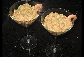 Elaboración: Comenzamos partiendo la cebolla en trozos pequeñitos, luego pelamos los langostinos (nos reservamos dos o cuatro para adornar) y los cortamos en dos o tres trozos y lo ponemos en el cuenco de la cebolla. Asimismo cortamos también el aguacate en trozos pequeños, pero no lo machaquéis. Si habéis decidido añadirle surimi o sucedáneo de caviar lo echáis también en esta mezcla. A esta mezcla le añadimos dos o tres cucharadas de salsa rosa, comprada o realizada en casa según el tiempo que tengáis.