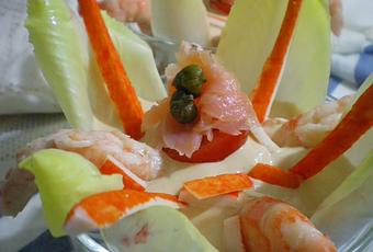 Otra presentación la preparé con endivias a modo de fondo de cesto, palitos de cangrejo, langostinos pelados y rollitos de salmón coronados con alcaparras sobre tomatito cherry .
