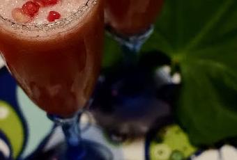 Preparar las copas mojando el borde con un poco del cóctel y untando de azúcar. Servir el coctel en las copas y decorar con algunos granos de fruta congelada. ¡Rico rico!
