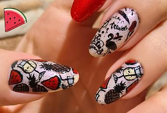 El diseño ya estáis viendo que tiene dos partes: en las uñas del pulgar y anular tenemos sandías 🍉, piñas 🍍 y copas de piña colada 🍹 😉. Y en la uña del corazón tenemos un heladito, un flamenco, una pluma, otra copa de cóctel y algunas palabras como "travel" o "best vacacion ever".