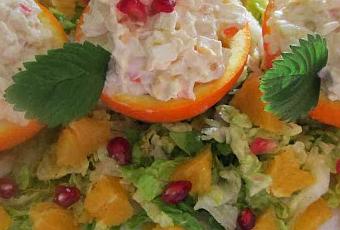 - Palitos de cangrejo. - Huevos cocidos. - Mayonesa. - Naranjas. - Lechuga. - Granada.
