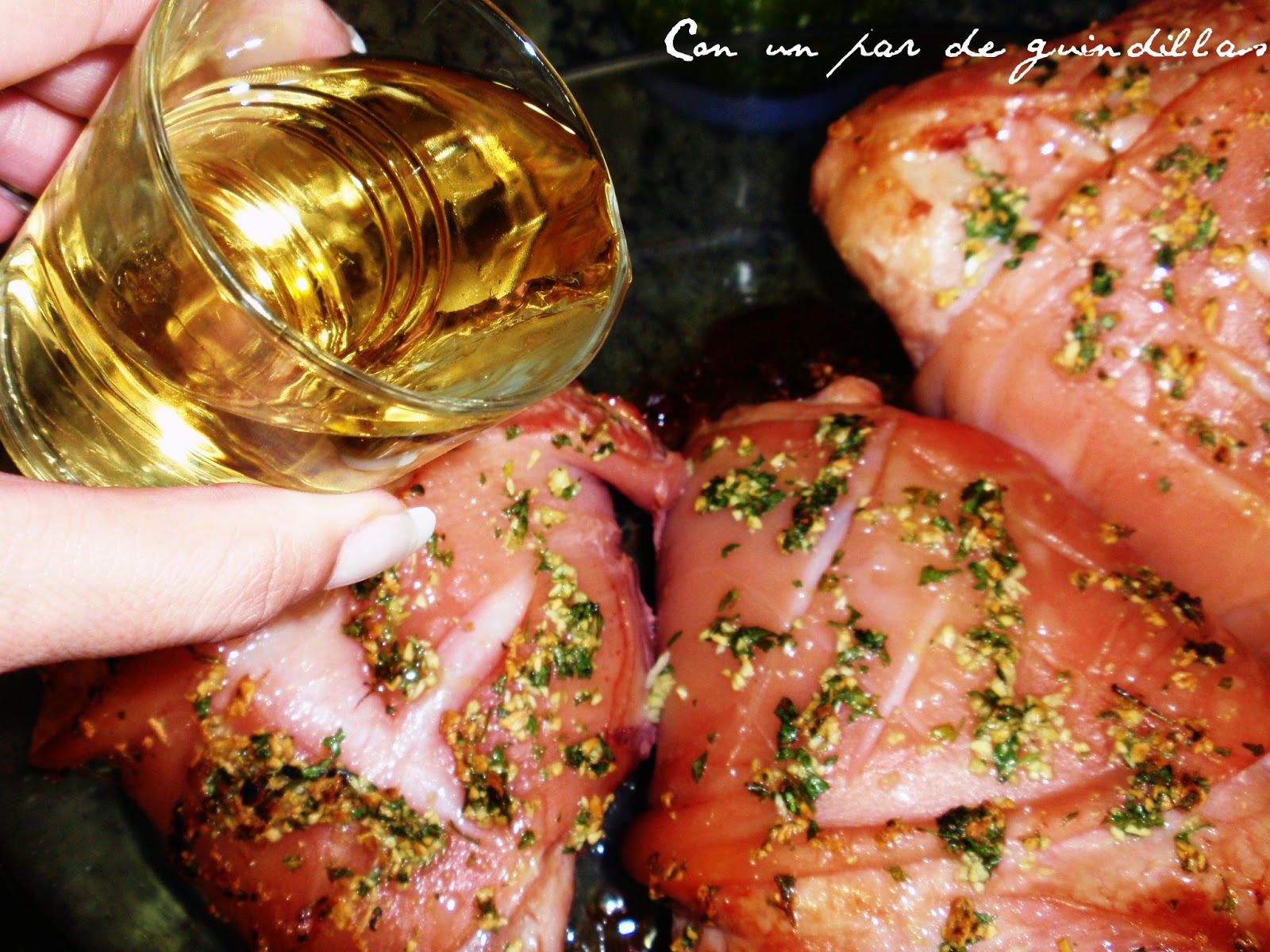 3.- En la primera vuelta se riegan con el vino blanco. Se sirven con ensalada y puré de patatas y con la salsita que queda en la bandeja del horno (la colamos y ya está).Añadimos el vino blanco