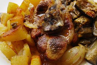 Ingredientes: (4 personas)- 4 cortadas grandes de codillo de cerdo- 4 patatas medianas- 2 berenjenas- 1 cebolla- 4 tomates maduros pequeños- 4 dientes de ajo- 1 vaso y 1/4 de agua mineral- 70 cl de coñac- pimentón de la vera dulce- 150 cl. De aceite de oliva- sal al gustoElaboración:En una fuente de horno (la negra baja que suelen llevar todos los hornos) poner el codillo, las patatas cortadas a esquinas, las berenjenas cortadas grandes (ver la foto), la cebolla cortada en 8 trozos, los tomates abiertos y los ajos con la piel. Sal al gusto.