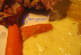 INGREDIENTES (para 2 personas): 1 codillo de unos 800 gramos, una hoja de laurel, 2 cebollas, 2 manzanas, 500 gramos de papas (patatas), 4 zanahorias hermosas, 6 dientes de ajo, 1 vaso de brandy, agua, sal, un chorretón de aceite de oliva, hierbas aromáticasELABORACIÓN: Comenzaremos por realizar unos cortes longitudinales lo más profundos posible, para que el codillo se haga más rápido. Introduciremos en una bandeja de horno la cebolla cortada en rodajas, los ajos con cáscara y golpeados, una hoja de laurel en el fondo del recipiente y las zanahorias peladas, así como el codillo. Salamos, rociamos con el brandy, agua y, finalmente, aceite de oliva. Lo tendremos en el horno unos 35-45 minutos a 200º, calor arriba y abajo. Si vemos que por arriba se está dorando mucho, dejaremos sólo calor abajo. Dar la vuelta, salar, regar de nuevo con un poco de aceite y mantener, unos 20-25 minutos más. Una vez finalizado si nos apetece la piel más dorada, pondremos el grill unos minutos, controlando de no pasarnos.
