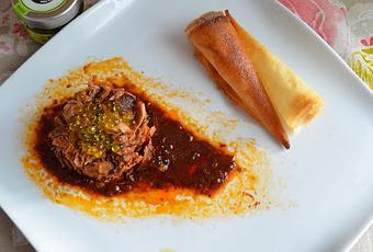 Una vez terminado de cocer los codillos lo sacamos lo deshuesamos y desmigamos, emplatamos como vemos en la fotografías, con un molde para emplatar, le damos forma bonita y redonda, ponemos salsa alrededor, encima el caviar de Aloe Picual y acompañamos con los cucuruchos de masa Brick.