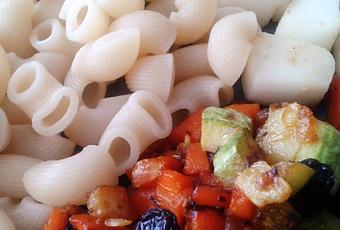 ELABORACIÓN: Guisar con agua, sal, una cucharada pequeña de aceite y orégano los coditos, proceder según las indicaciones del paquete. Cortar en trozos las verduras, poner una sartén con un poco de aceite (una cuchara pequeña), pochar la cebolla y los ajos. Últimamente prefiero poner la cebolla y luego añadir el ajo porque enseguida coge color. Ese será el momento preciso para añadir la zanahoria, en cuanto el ajo adquiere un poco de color. A los cinco minutos, pondremos el calabacín y las pasas. Aderezar con lo que más apetezca, por ejemplo: sal, ajo molido, cebolla molida, orégano y romero. Bajar el fuego y dejar que llegue al punto que os apetezca, al dente o bien hecha. Antes de montar el plato, daremos un golpe de calor a los restos de calamar y listo. ¡A comer!