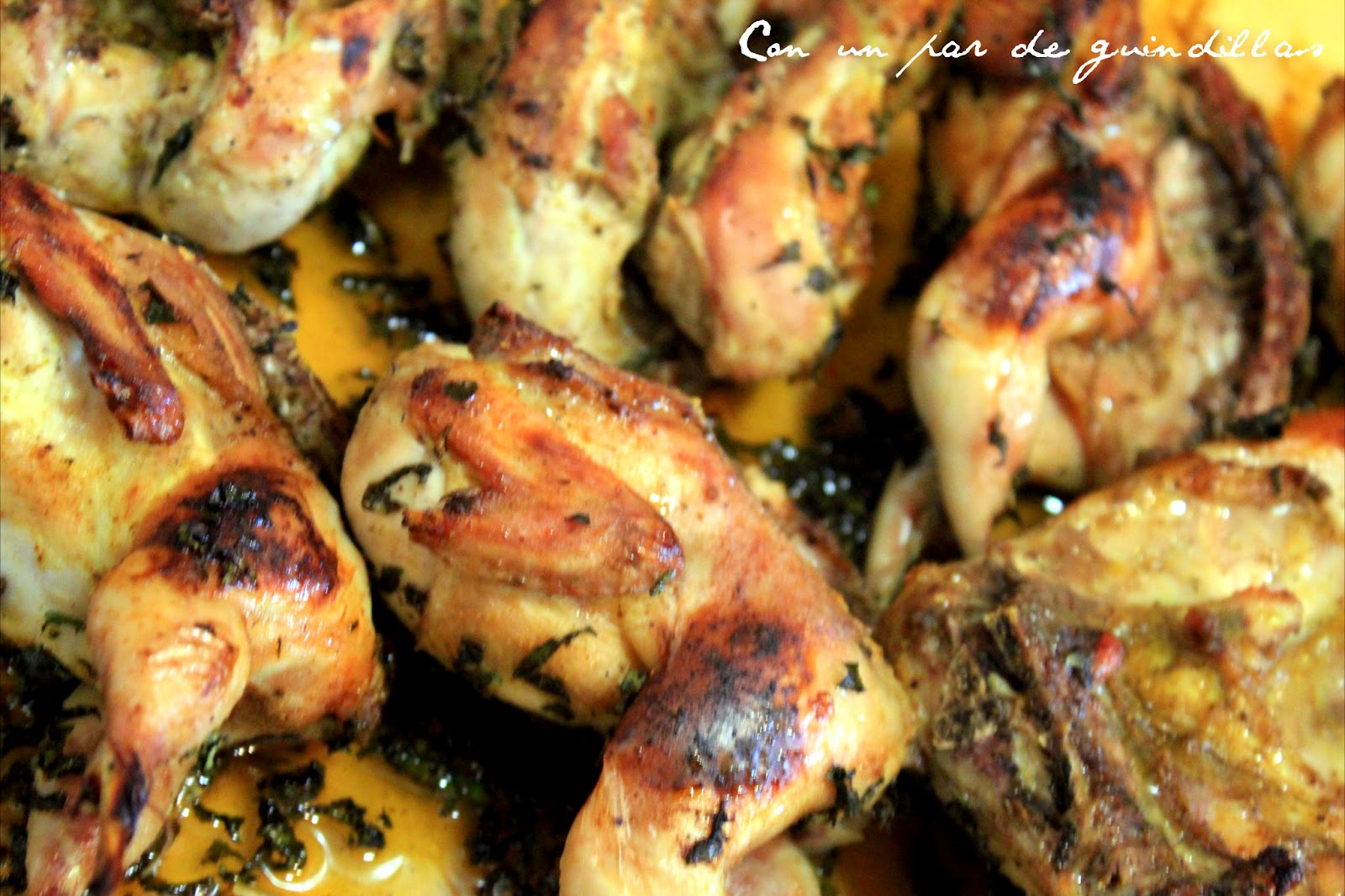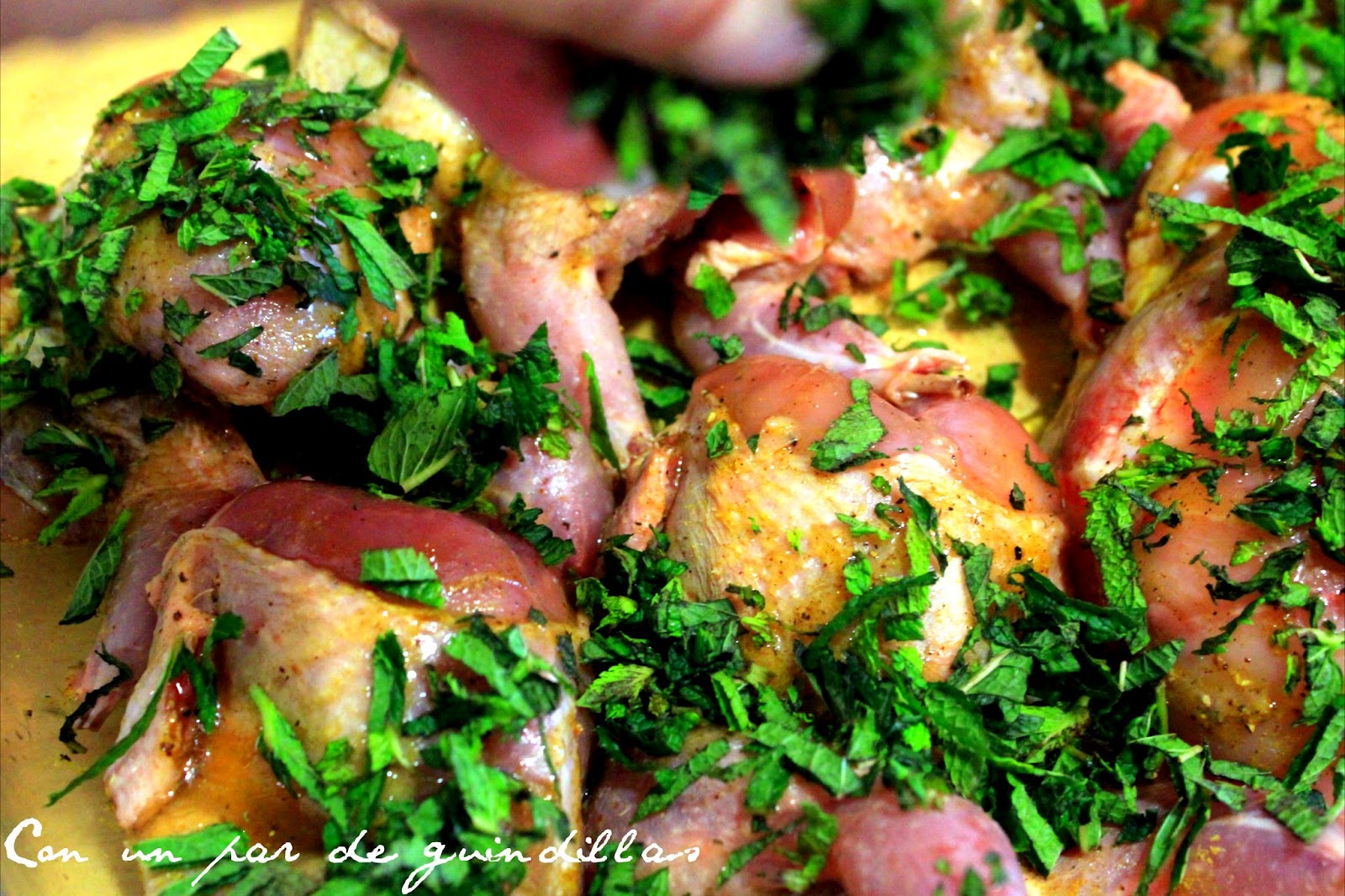 3.- Picamos la menta en juliana y embadurnamos las codornices con menta y miel.