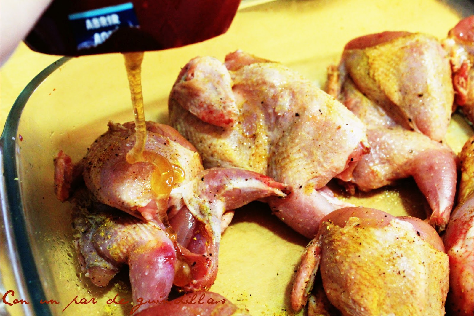 1.- Limpiamos bien las codornices, les quitamos las vísceras y alguna pluma que les quede y las partimos por la mitad por la espalda.