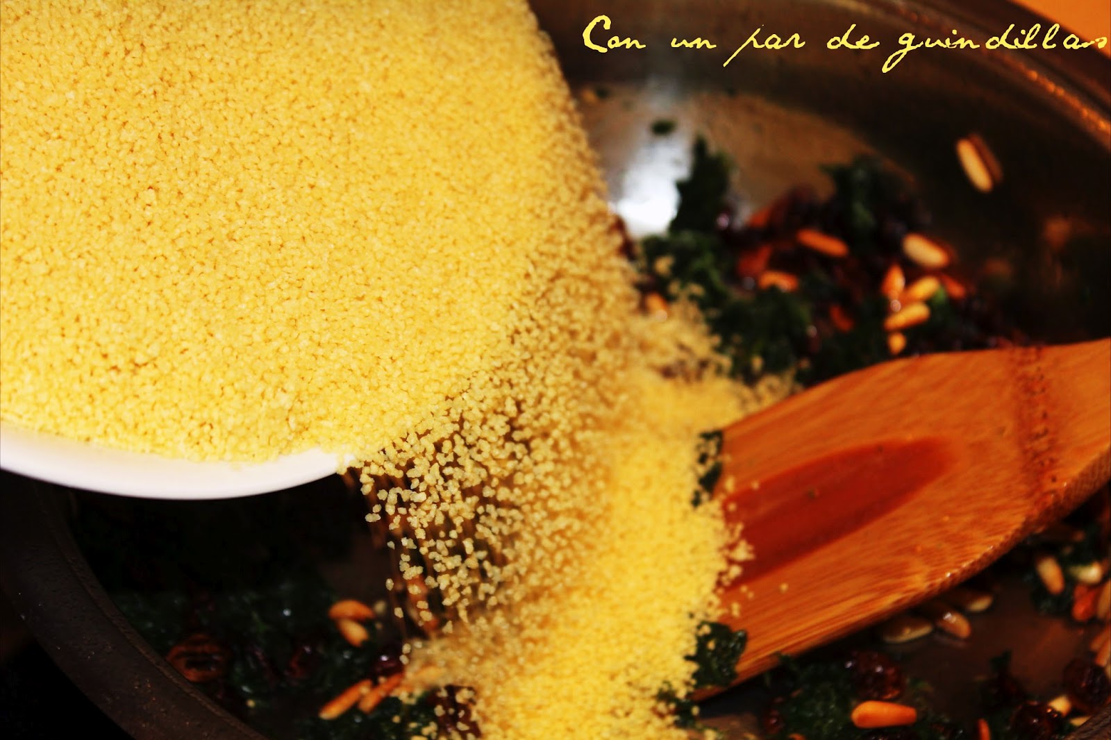 5.- Salteamos los piñones y las pasas. Rehogamos los granos de couscous con esa mezcla un par de minutos.