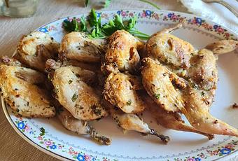 Hacía muchísimo tiempo que no tomaba codornices, pero estos días me he resarcido, porque en poco tiempo las he hecho dos veces. Buscaba algo para comer que no fuera lo habitual y que pudiera hacer en la airfryer de forma rápida, más que nada por experimentar. y puesto que son pequeñitas me pareció que podía ser una buena opción. Simplemente les hice un adobo con ajo, hierbas frescas y especias, las dejé un rato y luego las cociné de dos en dos durante 10 minutos... quedaron buenísimas! De hecho quedamos en que había que repetir, para asegurarnos que no había sido una casualidad. Y repetimos... y no, no había sido una casualidad, quedaron todavía mejor. Entre la primera vez que las hice y la segunda, había hecho alguna receta que se cocinaba directamente en la cesta de la freidora por aire, con muy buenos resultados, así que decidí probar, el resultado fue esplendido, quedaron sublimes!Pon tanto pasan a ampliar mi recetario personal, si gustáis aquí os la dejo.Y a los que no tenéis el aparatito, recordaros que este no es ni más ni menos que un horno pequeñito con mucha potencia, y que cualquier receta que se haga aquí, se puede hacer en el horno con un poquito más de tiempo.