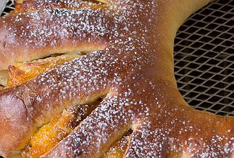 En una superficie ligeramente enharinada estirar la masa con un rodillo hasta obtener un rectángulo de 30 cm de alto x 45 cm de ancho aproximadamente. Extender la compota de duraznos y las nueces troceadas. Enrollar el pan como un brazo gitano y unir los extremos para crear un aro. Colocar el pan sobre una bandeja de horno engrasada y hacer cortes radiales sin llegar a separar las secciones. Cubrir con un paño de cocina enharinado y dejar levar por 45 minutos a 1 hora.