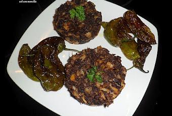 Partimos la col en trozos pequeños y la ponemos en la olla junto con el agua y un poco de sal.Se cierra la olla y se deja cocer durante unos 6 minutos. en una sarten `ponemos el aceite y sofreimos los ajos y un trocito de pan, una vez fritos se muelen en el mortero y se añaden a la col, poniendo tambien las morcillas, se deja dar un ultimo hervor a todo junto. Con los ajos y el pan. Y se acompaña con pimientos fritos.Los fogones de la Mari
