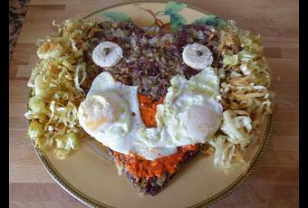 Ingredientes:col3 dientes de ajopan1 morcilla de cebollaaguasalsa de pimientos rojospuerroaceitesalPartimos la col en trozos pequeños y la ponemos en la olla junto con el agua y un poco de sal.Se cierra la olla y se deja cocer durante unos 6 minutos. en una sartén `ponemos el aceite y sofreímos los ajos y un trocito de pan, una vez fritos se muelen en el mortero y se añaden a la col, poniendo también las morcillas, se deja dar un ultimo hervor a todo junto. Con los ajos y el pan. Y se acompaña con una poca de salsa de pimientos, puerro y huevos fritos.Los fogones de la Mari