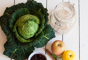 Corta la col en tiras finas (quitando el tallo) y salteala junto a la manzana unos minutos, luego añade medio vaso de agua y sal, tapa y deja cocer hasta que la col este blanda pero al dente.