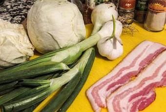 En primer lugar picamos en dados las lochas de bacon, laminamos los ajos y cortamos en tiras la cebolleta. Cortamos por la mitad la col y la hacemos tiras.