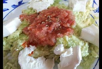 Ingredientes: 2 aguacates maduros. 1/2 tomate, cortado en cubitos muy pequeños. zumo de 1/2 limón. sal a gusto. pimienta al gusto queso de cabra fresco orégano gotas de tabasco Elaboración: Machacar el aguacate con el zumo de limón, a continuación agregar el tomate, sal pimentar y agregar las gotas de tabasco y el orégano por último colocar los trocitos del queso de cabra fresco.