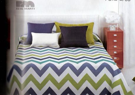 Ya desde los motivos gráficos notamos la diferencia - este año son espirales, rayas o lunares desiguales - pero es en el color donde la tendencia cambia completamente. Combinaciones varias, con tonos más vivos y brillantes, como el naranja, el turquesa o el verde oliva, mezclados con algún azul marino - inevitable en verano -, y con algún morado - éste simplemente inevitable cuando hablamos de colchas, temporada tras temporada -, y todo ello sobre fondos claros, como manda la estación.