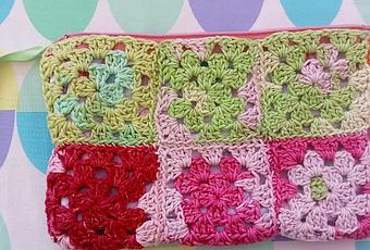 Seguí tejiendo grannies con los restos de las blusas que he hecho a mis hijas en las últimas semanas y con los últimos decidí unirlos para formar un estuche de lápices para el nuevo curso.